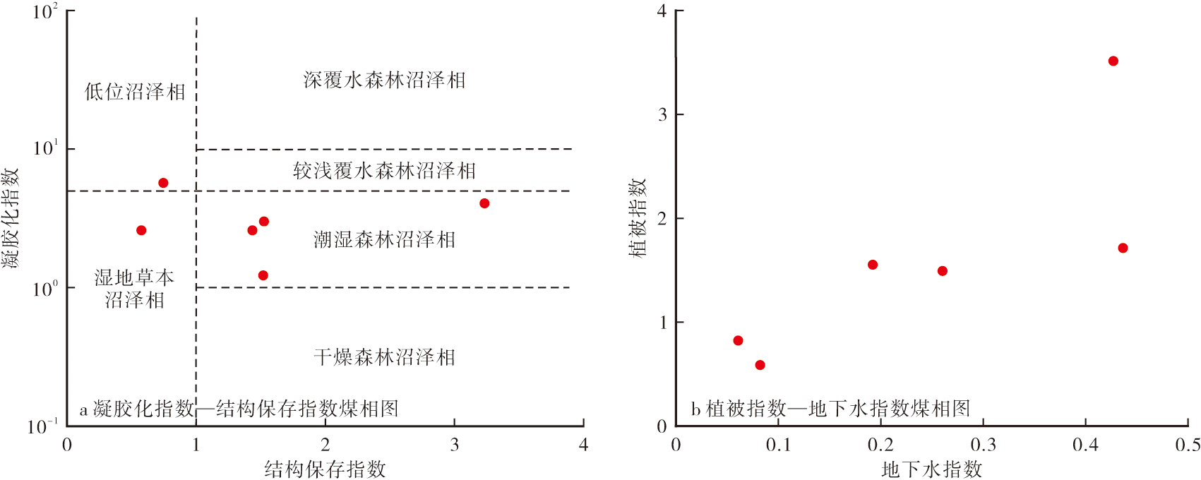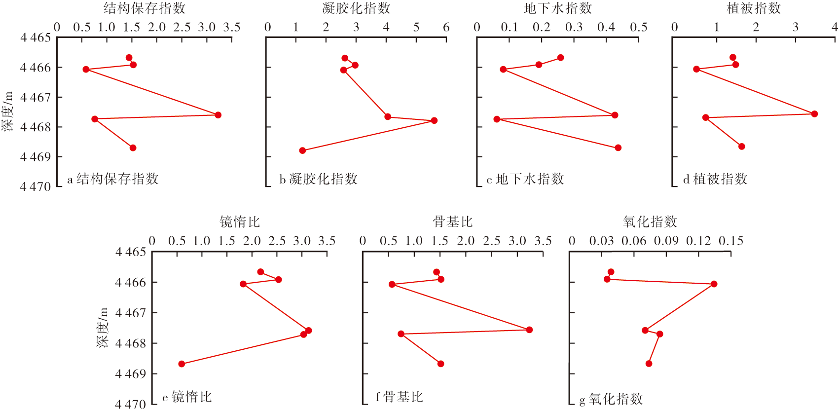 岩心 编号 | 镜质组 含量/% | 惰质组 含量/% | 结构保存 指数 | 凝胶化 指数 | 地下水 指数 | 植被 指数 | 镜惰比 | 骨基比 | 氧化 指数 |