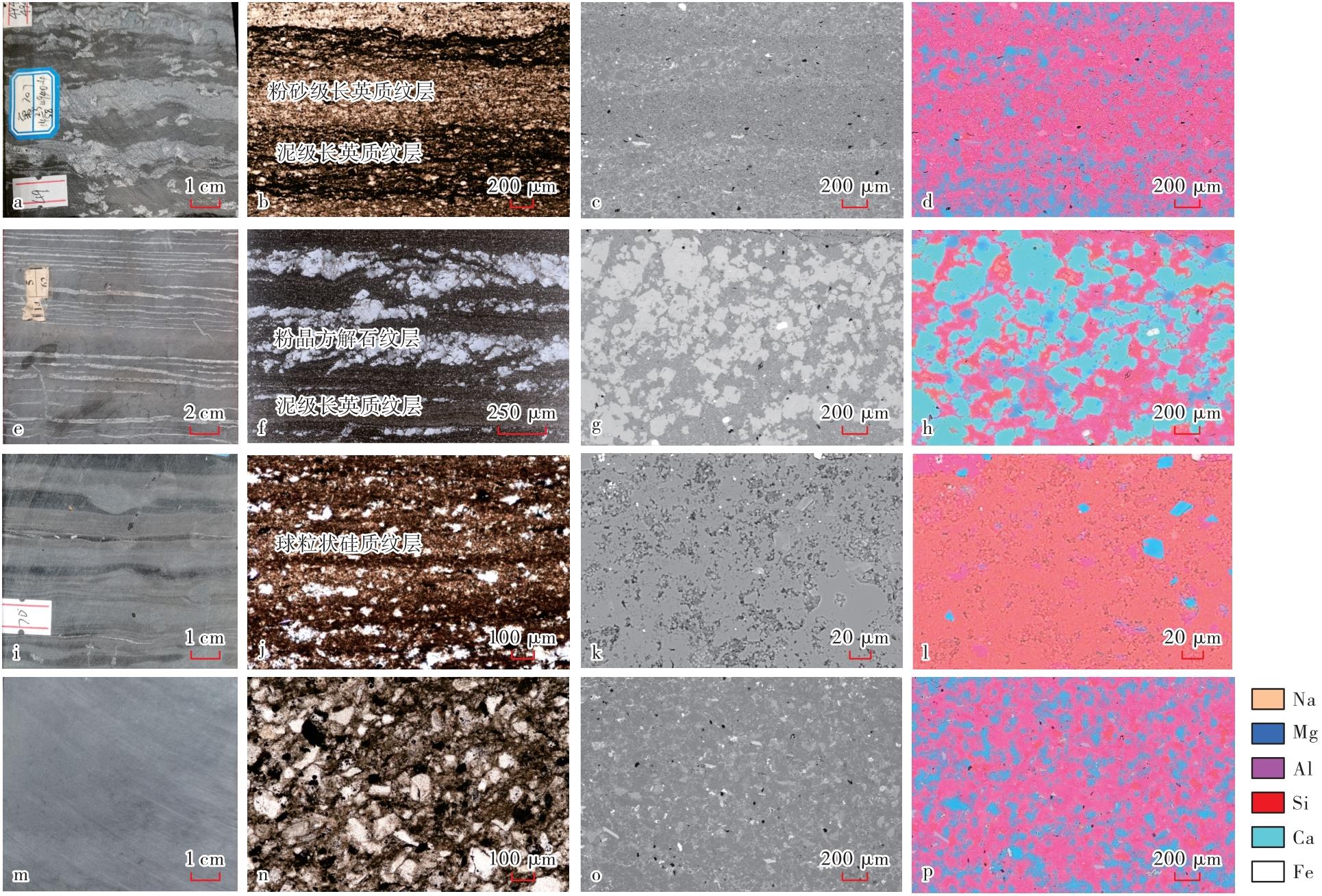玛湖凹陷风城组纹层及岩相特征 a—纹层状长英质页岩,夏207井,4 940.4 m,岩心;b—纹层状长英质页岩,发育粉砂级长英质纹层和泥级长英质纹层,夏207井,4 940.4 m,单偏光;c—纹层状长英质页岩,夏207井,4 940.4 m,扫描电镜;d—纹层状长英质页岩,夏207井,4 940.4 m,能谱;e—纹层状灰云质页岩,夏203井,4 711.9 m,岩心;f—纹层状灰云质页岩,发育粉晶方解石/白云质纹层和泥级长英质纹层,夏203井,4 711.9 m,单偏光;g—纹层状灰云质页岩,夏203井,4 711.9 m,扫描电镜;h—纹层状灰云质页岩,夏203井,4 711.9 m,能谱;i—纹层状硅质页岩,夏203井,4 781.5 m,岩心;j—纹层状硅质页岩,发育球粒状硅质纹层和泥级长英质纹层,夏203井,4 781.5 m,单偏光;k—纹层状硅质页岩,夏203井,4 781.5 m,扫描电镜;l—纹层状硅质页岩,夏203井,4 781.5 m,能谱;m—块状粉砂岩/粉砂质页岩,玛页1井,4 693.3 m,岩心;n—块状粉砂岩/粉砂质页岩,发育大量粉砂级碎屑颗粒,单偏光;o—块状粉砂岩/粉砂质页岩,玛页1井,4 693.3 m,扫描电镜;p—块状粉砂岩/粉砂质页岩,玛页1井,4 693.3 m,能谱。"