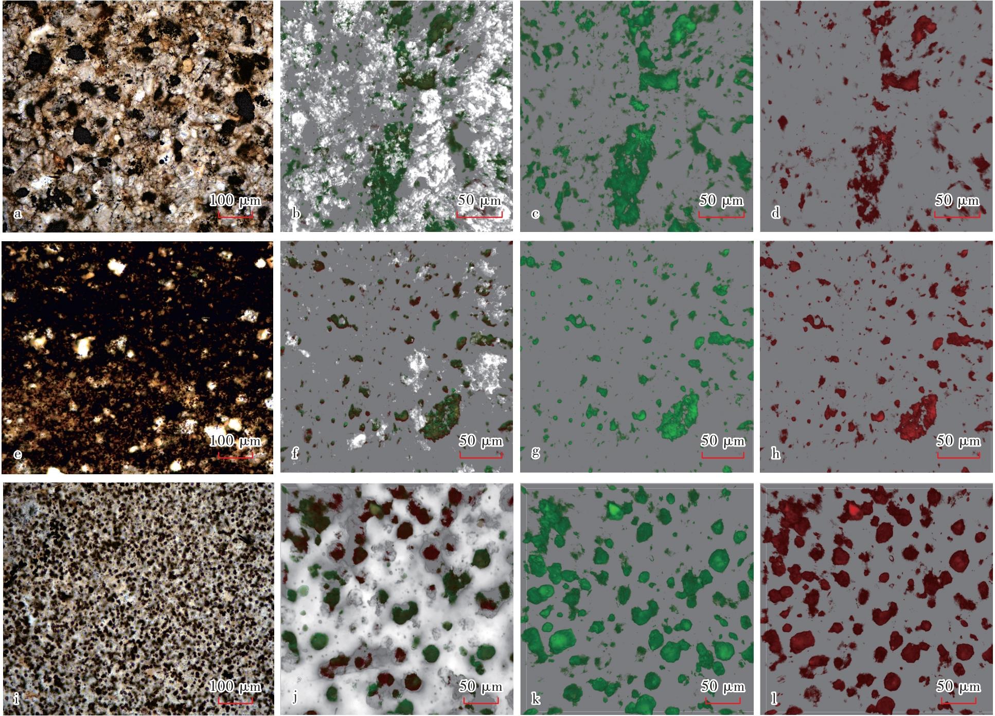 玛湖凹陷风城组夏203井4 678.7 m处不同纹层页岩油赋存特征及差异 a—粉砂级长英质纹层,单偏光;b—粉砂级长英质纹层轻质和重质组分叠合,CLSM轻/重比为1.32,激光共聚焦;c—粉砂级长英质纹层轻质组分,激光共聚焦;d—粉砂级长英质纹层重质组分,激光共聚焦;e—泥级长英质纹层,单偏光;f—泥级长英质纹层轻质和重质组分叠合,CLSM轻/重比为0.90,激光共聚焦;g—泥级长英质纹层轻质组分,激光共聚焦;h—泥级长英质纹层重质组分,激光共聚焦;i—球粒状硅质纹层,单偏光;j—球粒状硅质纹层轻质和重质组分叠合,CLSM轻/重比为1.03,激光共聚焦;k—球粒状硅质纹层轻质组分,激光共聚焦;l—球粒状硅质纹层重质组分,激光共聚焦。"