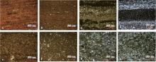 吉木萨尔凹陷芦草沟组主要岩性沉积构造特征(据文献[46]修改) a—超薄层状结构,页岩样品23-71,3 585.08 m,单偏光;b—超薄层状结构,页岩样品10-53,3 515.96 m,单偏光;c—薄层状结构,页岩样品33-21,3 708.08 m,单偏光;d—薄层状结构,页岩样品20-71,3 576.16 m,正交偏光;e—块状结构,页岩样品28-11,3 661.21 m,单偏光;f—块状结构,碳酸盐岩样品31-21,3 704.24 m,正交偏光;g—块状结构,粉砂岩样品25-71,3 661.52 m,正交偏光;h—块状结构,粉砂岩样品10-53,3 524.69 m,正交偏光。"